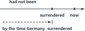 这个句子的时间副词是“算到德国投降为止”,所以是一个到过去时间截止的箭头。这就是过去完成式。动词 had not been 表示“尚未”,就是“已经”的相反。be 动词仍不必翻译。补语部分 defeated 是过去分词,表示被动的形容词,“被打败”用来形容主语“日本”。