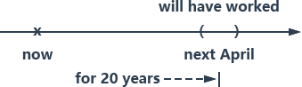 这个句子中有括出时间 next April,看起来好像要用简单式。可是另外还有一个时间副词 for 20 years,是一个箭头。你不可能在四月这个月内替公司工作 20 年,所以 next April 只是一个截止时间,表示“算到四月为止有 20 年”来修饰动词,所以要用完成式。动词前面加上 will,表示到现在还没有,要到四月才“会”做满 20 年,也就是未来时间的完成式。
